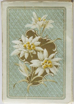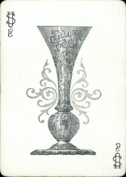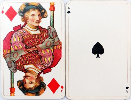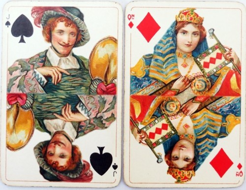The court figures are based on original paintings by the illustrator John H. Bacon, who also illustrated titles such as: Pharos the Egyptian (as serialized in the Windsor Magazine in 1898), The Marriage of Arthur and Guinevere, Jane Eyre Illustrated. Editions with advertising backs are also known, eg Hotels of the Midland Railway. The pack also contained a Joker showing a jester playing a guitar and riding on a donkey, with the caption "Laugh! and the world laughs with you."
