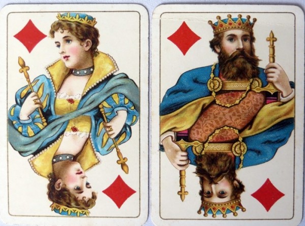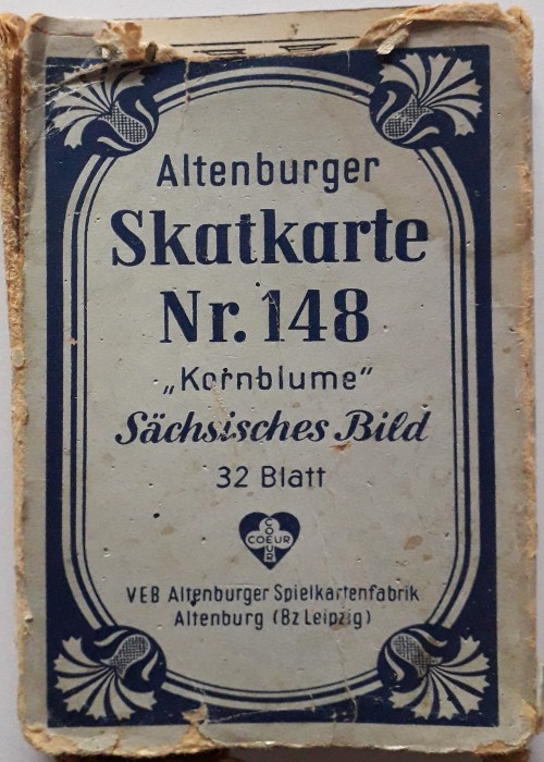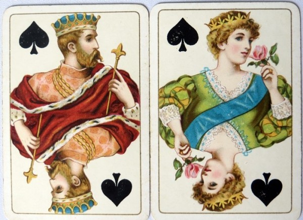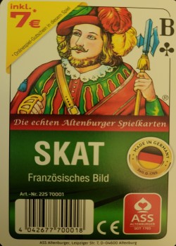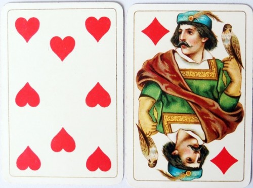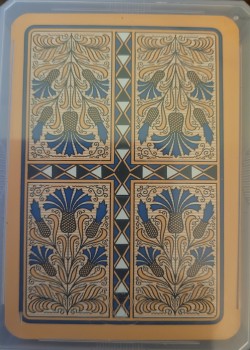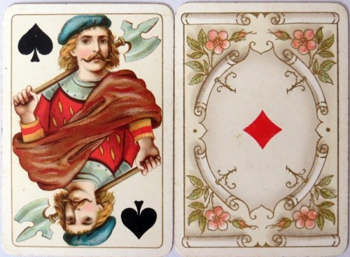 From the 'World of Playing Cards' : Beautiful court cards and floral backs. The designs have clear outlines which stand out against a tinted background. The two black Jacks carry halberds; the Jack of Clubs reads “B. Dondorf” and “Frankfort a/m”. The other two Jacks are a falconer and an archer. Although the court figures are not an accurate reflection of any historical period, this deck has been nicknamed “Rococo”. The cards are slightly small by contemporary standards, measuring 85x58mm. This pattern was published between 1889-1933, at first with no Joker, which was added in 1906 along with small indices in German or English.