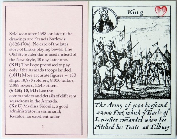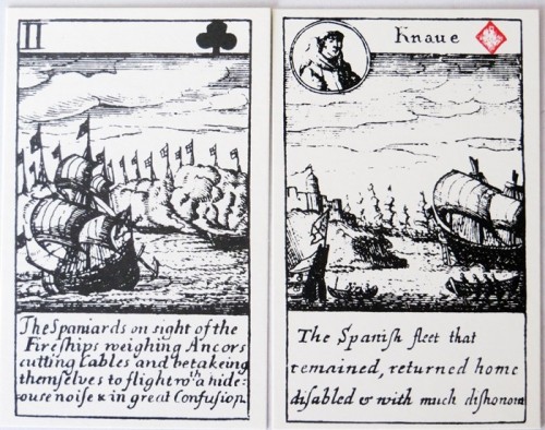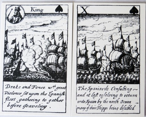 Published on the 400th anniversary of the Spanish Armada. Roman Numeral for Ace to 10 (ie. I,II,III.....X), then 'Knave', 'Queen', 'King'.