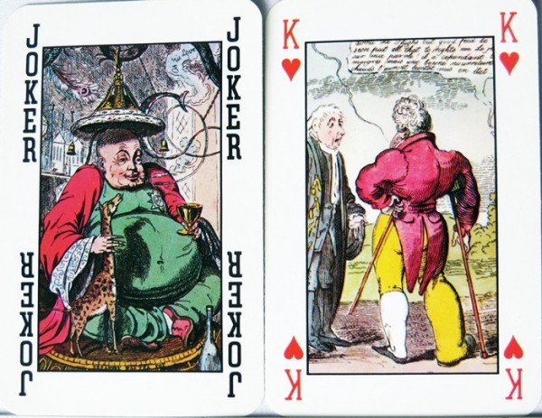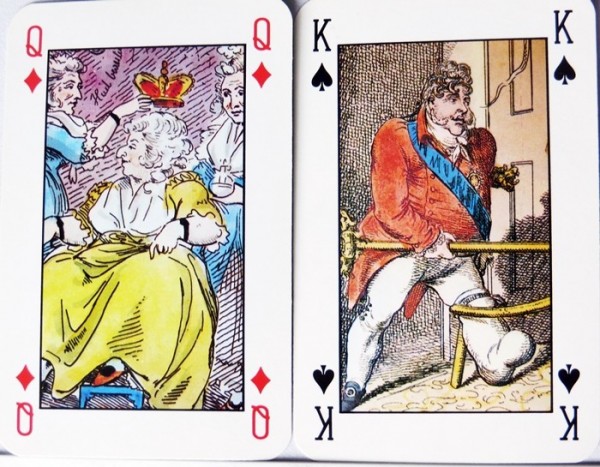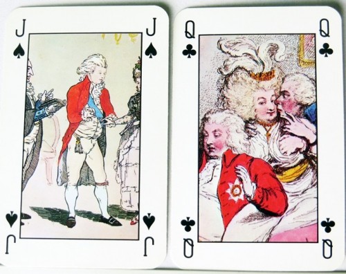 From the 'World of Playing Cards': The “Royal Pavilion at Brighton” playing cards, depicting caricatures of Regency period life, is also known as the “Regency Deck”. The Royal Pavilion is a former royal residence located in Brighton, England. It was built in three stages, beginning in 1787, as a seaside pleasure retreat for George, Prince of Wales (from 1811 Prince Regent), in an opulent Indian style with extravagant chinoiserie interiors.