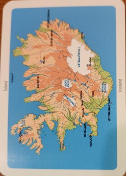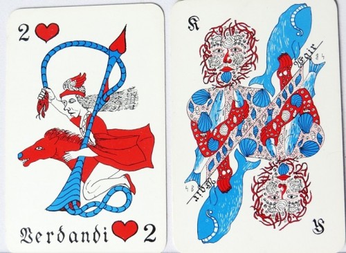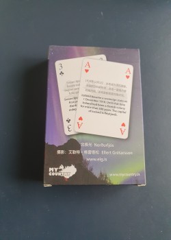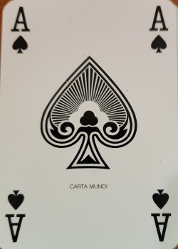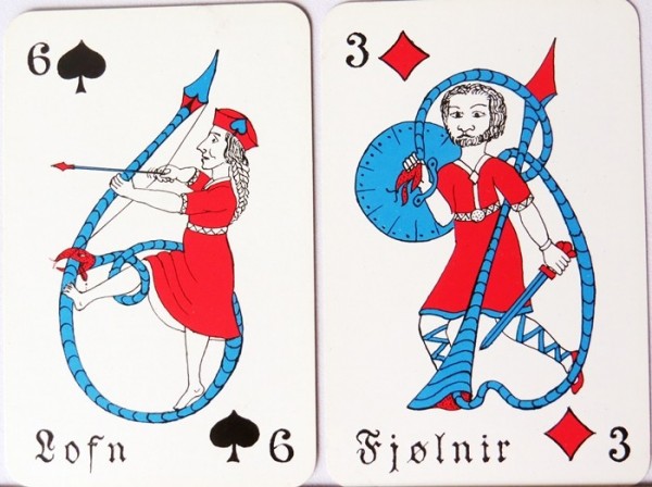 From the 'World of Playing Cards': The ace of spades depicts Himinbjorg, the celestial mountains where the rainbow Bifroest touches the sky. The fallen heroes rode along Bifroest to Valhalla. The ace of diamonds depicts the Ash of Yggdrasil, the world tree. Its root is divided into three parts. One is situated in Nifilheimur (the Underworld of Mist) where the well Hvergelmir is. The second is in Jõtunheimar (World of Giants) where Mimis well is found, and the third in Micklegarth (Old Icelandic name of Constantinople) with the Urd well. From it the three Norns (Fates) bring the gods the drink of wisdom. The ace of hearts represents Valhalla, the residence of Odin and the fallen heroes. It was bright as gold and covered with shields. The ace of clubs depicts the Starred Sky, created from the skull of the giant Ymir. Four dwarfs support it; East, West, North and South.