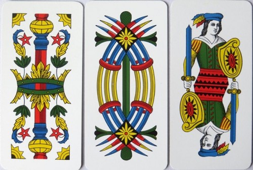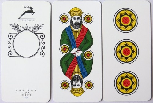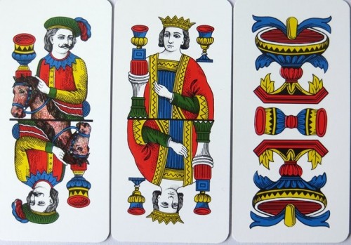 Italian regional pattern. From 'The World of Playing Cards': Primiera Bolognese was a gambling game played in Italy from the first half of the 16th century and this pattern derives from that period or even earlier. As it is now produced as a double-ended deck, some archaic features have been chopped off. Originally it had maids instead of jacks in cups and coins (a feature shared in Florentine Minchiate) and it also shares court card designs with Tarocco di Bologna. The dragon head on the ace of swords can still be seen.