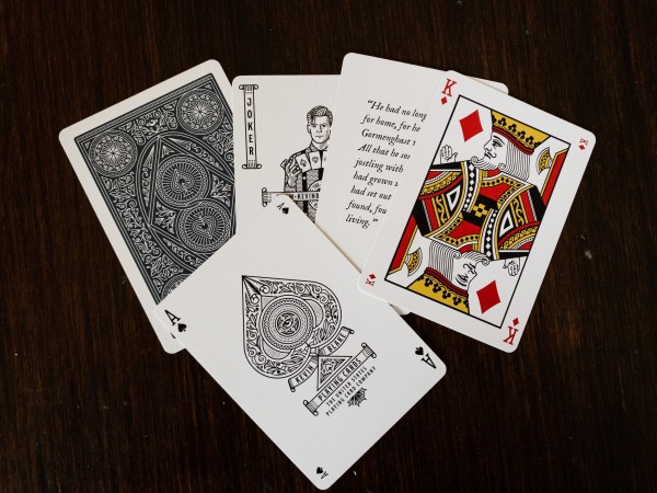The Illusionist Playing Cards impress with beautiful custom ornamentation as well as a paper plane motif that pays tribute to the opening illusion in Kevin Blake's theater show in San Francisco. The Illusionist Playing Cards feature custom Jokers, Ace of Spades and advertising cards. The tuck case was printed by Clove St Press and uses letterpress, gold foil, and embossing.