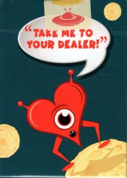 Each deck includes nearly-identical Jokers with a built in reveal, as well as 2 special gaff cards. All of the cards are placed into suspended animation inside a custom tuck box with a custom sticker seal for their interstellar travels.