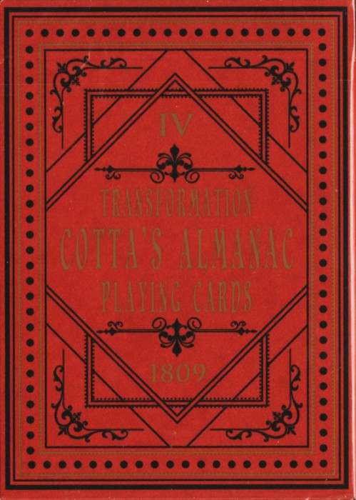 The red "Turandot" deck is the fourth in a series of six famous transformation playing card decks we plan to release... This fourth Cotta's almanac playing cards deck was originally published in 1809. There is no known evidence of any deck issued in 1808, and so this red almanac issued in 1809 is considered to be the fourth in a series.