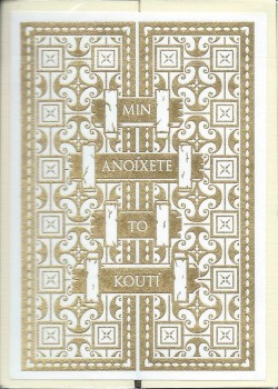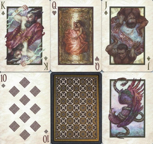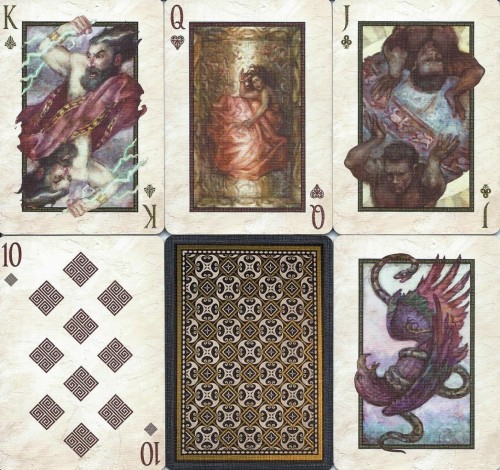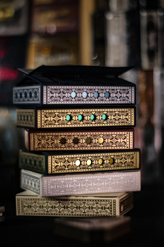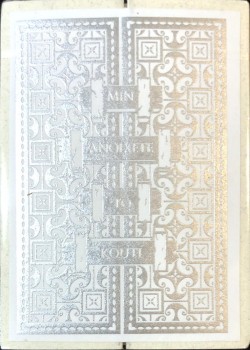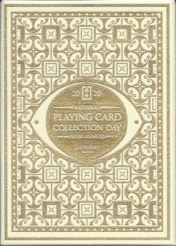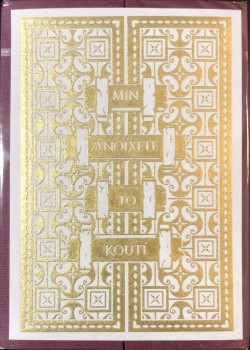 The 2020 NPCCD theme is Hindsight based around the tragedies of classic Greek mythology, most notably around Pandora's box and her husband Epimetheus. Features a transforming enclosure that expands the box into a larger temple to display a classic golden frieze on all sides. Sealed across the box is an intaglio gold engraved warning to not open Pandora's box. The Hope Deck has a Silver on Navy tuck box and Aquamarine Gilding. This deck was an exclusive add-on to participants of the October 2020 52+Joker virtual convention, therefore only 488 produced.