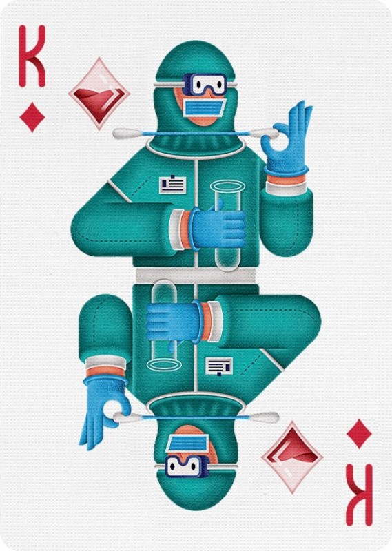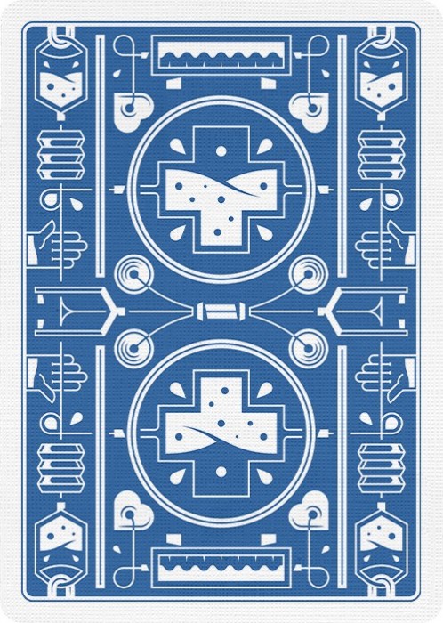 The back design features blue metallic ink with symbols that represent a hospital. Every single card in the deck is filled with doctors and nurses with different operations; from Monitoring X-Rays, working with surgical tools, to offering large pills and needles.