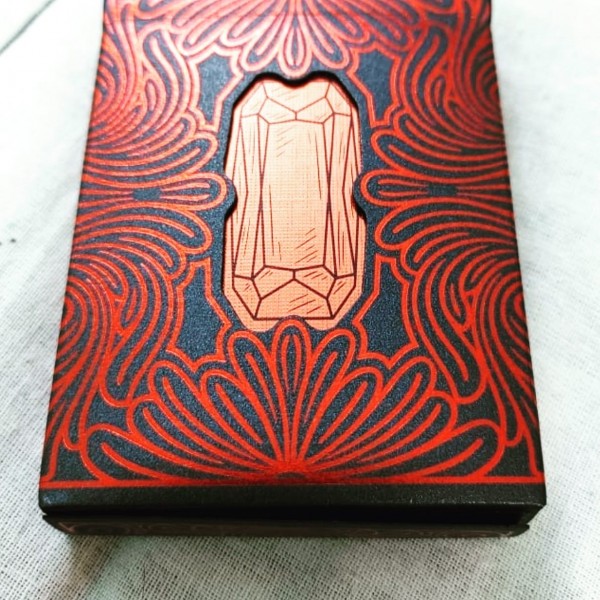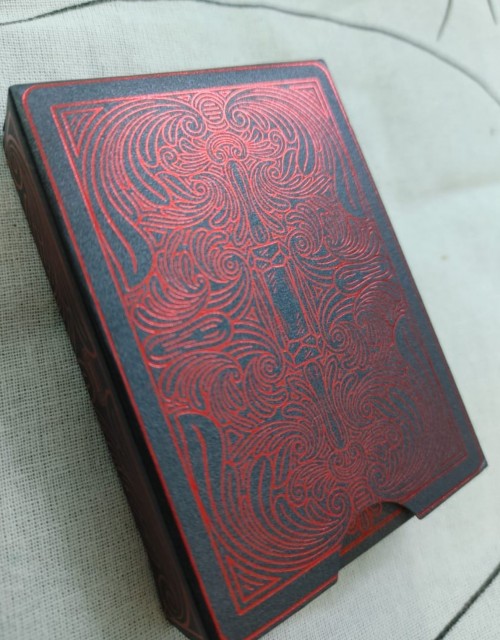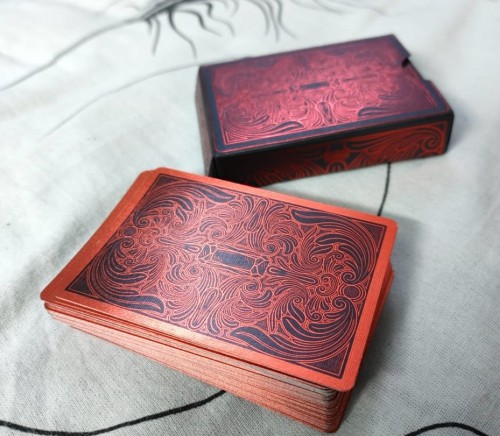 This deck is produced by Azoth Playing Cards a luxury card brand in China. This deck was released in China. 900 of them were printed to be sold in China and less than 100 of them made it outside China and less than 12 of them made it to USA .So much foiling is used in this deck that the blank card looks like a metal card but the deck handles smoothly. A true gem to display in your collection