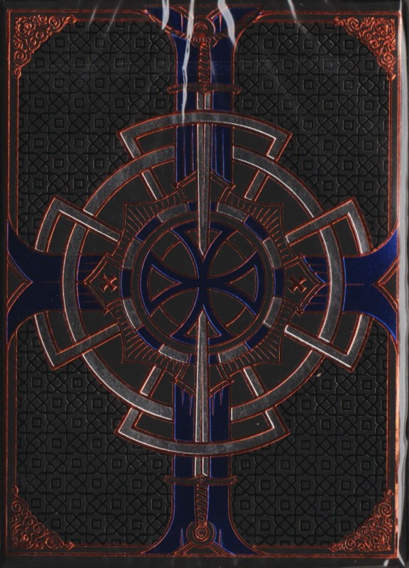 The backs in red/blue, black and gold/copper shows the cross and the sword, symbols from the Templar imagery, in an elaborate symmetrical composition. That symbology is also present in both jokers.