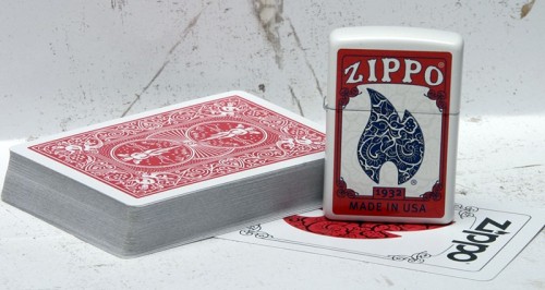 This combination gift set ups the ante with a standard deck of Bicycle playing cards, plus four bonus Zippo-customized cards, and a white matte Zippo lighter featuring a color imaging design.