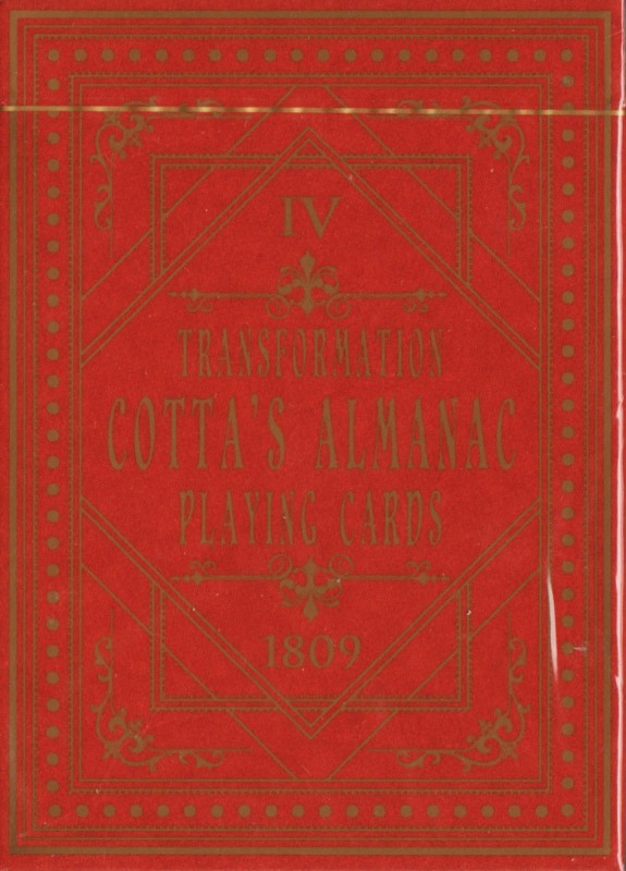 The very first transformation deck issued by Cotta is from 1805. This deck is probably the most famous of all six, and is incredibly scarce. Original illustrations were fiddling artworks done by hand, on copper plates that were manually engraved with stipple and etching, and the cards were printed on linen period stock that was 97 mm x 69 mm in size, with blank card backs and squared corners at that time. Only the court cards were hand-colored, while the number cards used red stencils.