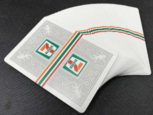 Deck features custom, uni-directional card back design. The stripes on the card back are full bleed and can be seen from the side of the deck when stacked. Court cards are modified standard, using the corporate colors of 7-Eleven (green/red/orange). Jokers are Bicycle Standard (one colored, one black-and-white). The deck MAY contain ad cards for discounted snack foods.