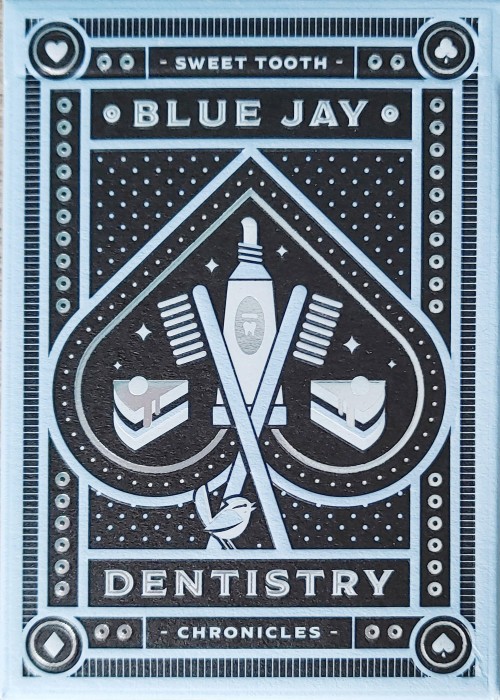 One of four decks in the Blue Jay Dentistry kickstarter Project, put out by Meadowlark Playing Cards and designed by the talented Elettra Deganello. It could be purchased individually or as a limited edition set (350 produced) entitled "the Sweet Tooth Chronicles". The other decks in the set are gilded Silver Frosting and a standard version of both decks.