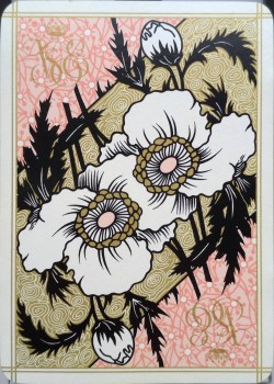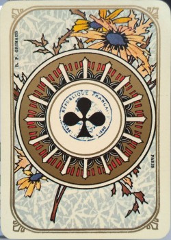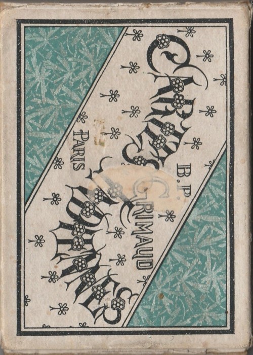 This wonderful, colorful deck was printed in chromolithography and published by B.P. Grimaud from Paris as "Cartes Indiennes" in 1890. The courts all show Indian figures as Kings, Queens and Jacks and they are set against a floral background design. On the number cards we also find a floral design in the background, which gives the deck an Art Nouveau look. The Whist deck of 52 cards has gold edges and there are some gold printed details on the courts too. It was obviously a luxury edition.