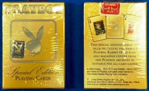 Playboy Special Edition playing cards printed by the USPCC. Each card has one of the covers from the vast Playboy archives and comes finished with a faded gold background and a silver Playboy bunny backing. Ranging from the 60\\\'s to the late 90\\\'s, you\\\'ve got plenty of viewing pleasures for your long poker nights! Gather your mates, crack open a few beers and feast your eyes on the bevvy of beauties contained in this single deck of cards!