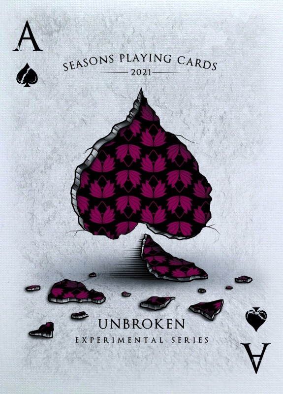 The rare UNBROKEN series was launched by Seasons Playing Cards in a unique mystery deck sale. This was an experimental launch based around the premise that each deck would be unique in its own way. Only 250 “experiments” were produced in this extremely labor intensive project. Each piece is signified by a holographic seal featuring the Seasons logo featuring an ‘X’ indicating the eXperimental series along with a ‘1 of 1’.