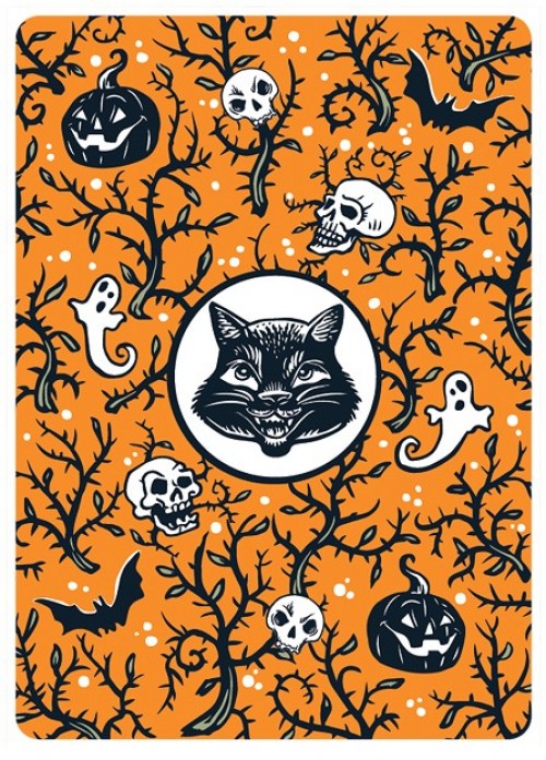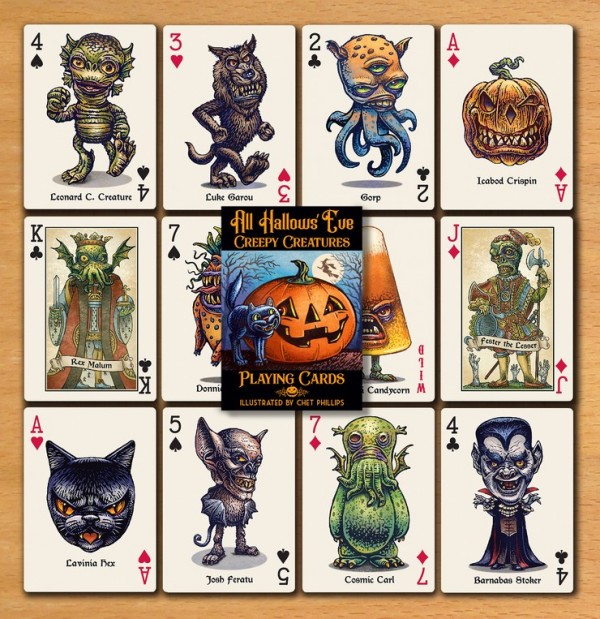 All Hallows' Eve Creepy Creatures Playing Card Deck. A plastic coated poker sized deck of playing cards showcasing 58 individual monster portraits and their names from illustrations by Chet Phillips. Deck includes 2 Jokers and 4 Wild Cards.
