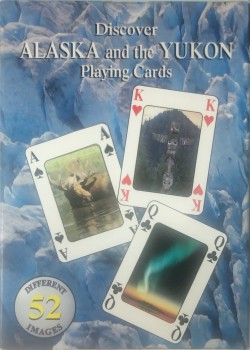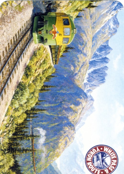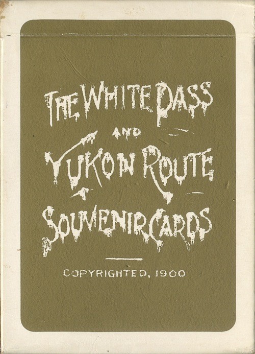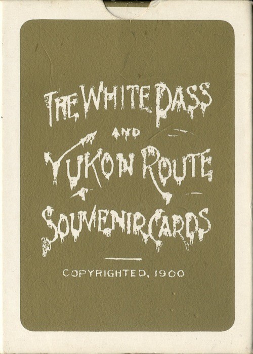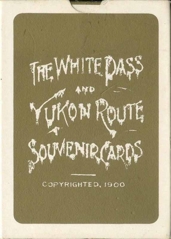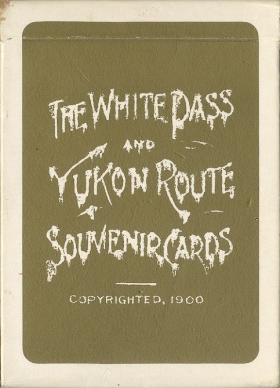 Facsimile produced exclusively for Murdoch\'s Gem Shop, Whitehorse, Yukon Territory, Canada. This deck is a reproduction of one of four different decks which were made for the White Pass & Yukon Train Route. There are 52 cards, each featuring an oval photo scene from along the route, and one Table of Distances card with a map of the route on the reverse. Included is a leaflet telling the story of the times. In the year 1898 the greatest gold rush the world has ever seen took place. It has been estimated that 100,000 people worldwide started out, and 30,000 of them actually reached Dawson City. To accomodate the gold seekers White Pass built a 110 mile narrow gauge railaroad, that had been called impossible, through the 3,000 foot high White Pass in the coastal mountains. Two years later a fleet of sternwheel river boats were added to the transportation system and the playing cards reproduced here were provided to the passengers. Ace of Hearts - shows the arrival of the first passenger train at the summit on Feb. 20, 1899. King of Hearts - shows the stop at \'Clifton\'. Queen of Hearts - shows the train on the \'Trestle over Glacier Gorge at Tunnel\'. Jack of Hearts - shows the train \'Near the Tunnel\'. Ace of Clubs - shows a train car underneath the \'Hanging Rocks of Clifton\'. King of Clubs - shows the \'First Passenger Train Over Summit\', Feb. 20, 1899. Train stopped on trestle before entering tunnel. Queen of Clubs - shows \'East Fork from Rocky Point\'. Jack of Clubs - shows a scene of men working on the railroad. Ace of Diamonds - shows \'A stop\' at the summit with passengers waiting to board. King of Diamonds - shows the train \'Approaching Skagway\'. Queen of Diamonds - shows a view leaving the tunnel, \'Looking South from Tunnel\'. Jack of Diamonds - shows the train stopped at \"rocky Point\'. The Ace of Spades - shows the train with two steam engines with the caption \'White Pass and Yukon Express\'. It is in black and white. King of Spades - shows the train on a trestle with the caption \'Among the Clouds\'. Queen of Spades - shows the train with a flatcar of early sightseers with the caption