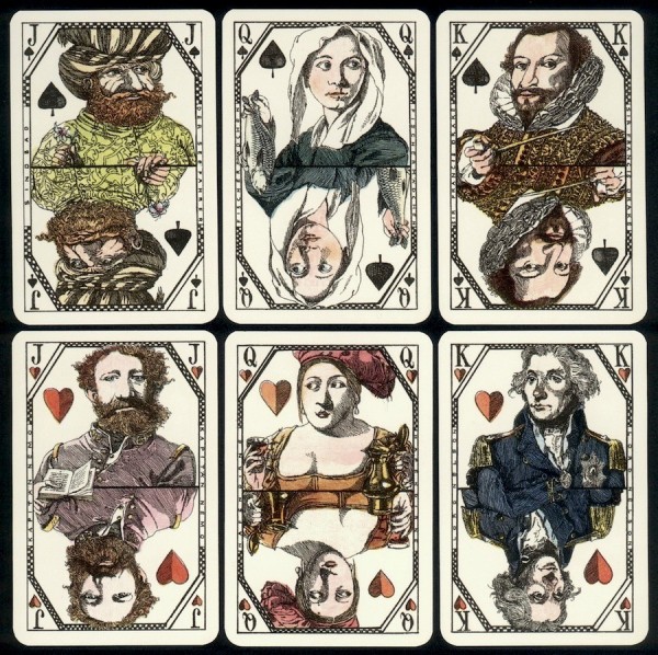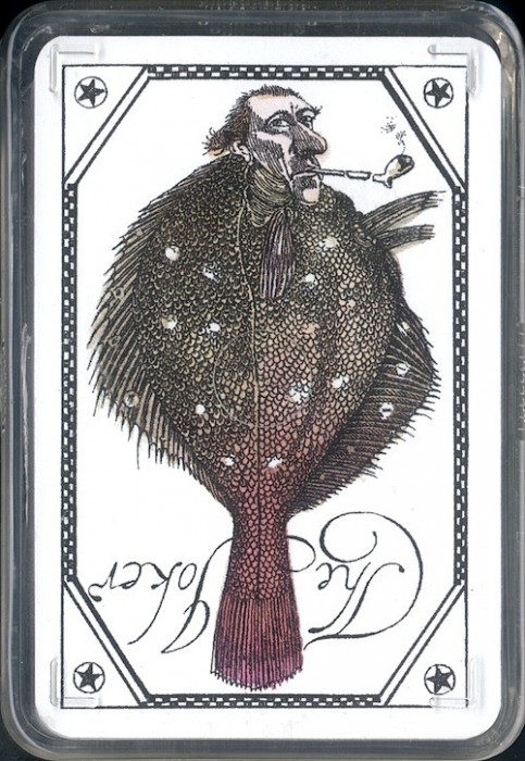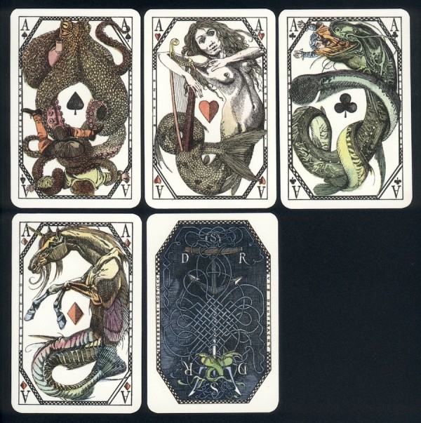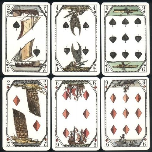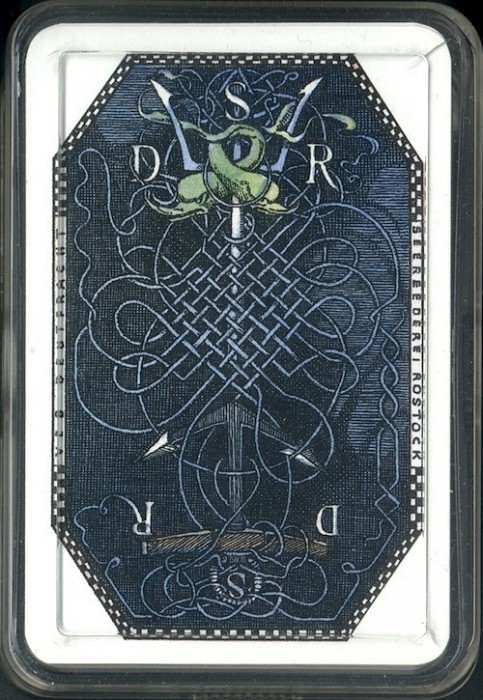 Issued by Coeur in Germany. This is a Poker sized deck with 52 cards + 3 jokers. The cards are 5.8 cm x 8.8 cm. Publicity deck for DSR, Deutsche Seereederei Rostock, an East German sea-going shipping company. Drawings by artist KLAUS ENSIKAT that relate to sailing and the city of Rostock. On the Aces are sea monsters. The harbour is the heart of the maritime city of Rostock. Although there may be fewer sailors on the quayside these days, the harbour still shapes the character of the city. It is the largest city in the north German state Mecklenburg-Vorpommern and located on the Warnow river; the quarter of Warnemünde 12 km north of the city centre is directly located at the coast of the Baltic Sea. This is the second deck illustrated by Klaus Ensikat for DSR. The first was made in 1976 and featured figures all reflecting the city of Rostock & its aspect on the sea.