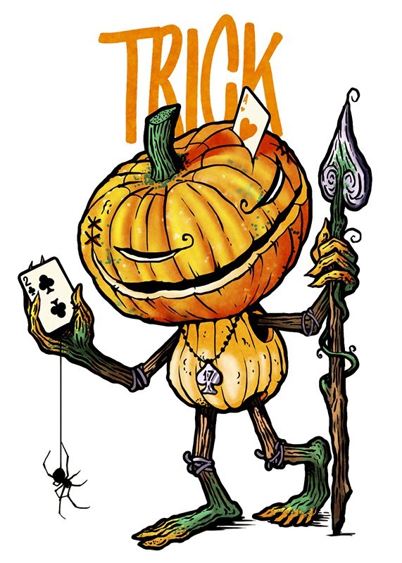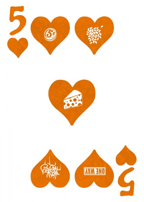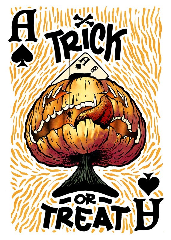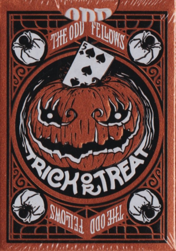 The JAKKO mini deck features pearlescent orange stock with black and white foiling. A skeletal embossing is applied across the face of the tuck. 17 marks scratch across the top signifying the date of the launch and the number of Stockholm17. On the face of the deck is a Jack-o-lantern featuring a 5 of Spades reveal and spider iconography in the four corners.