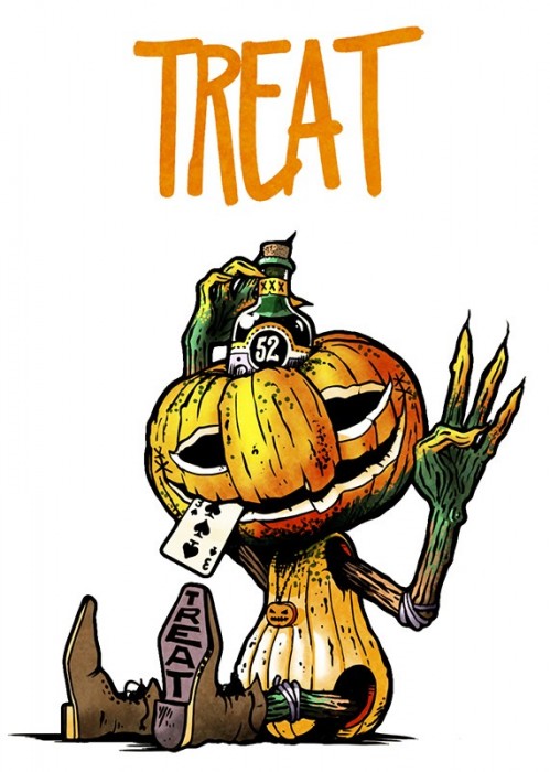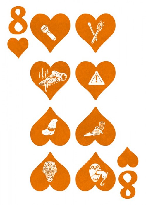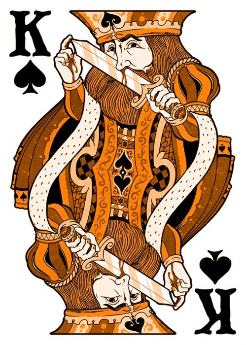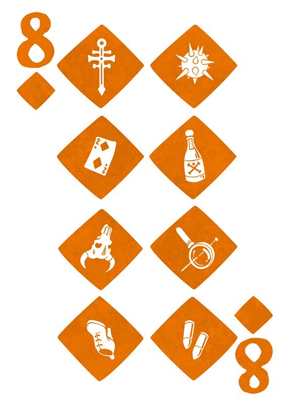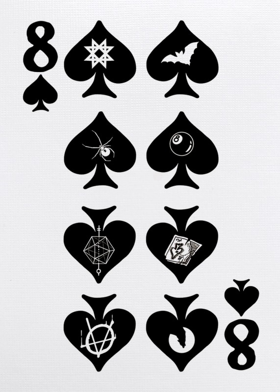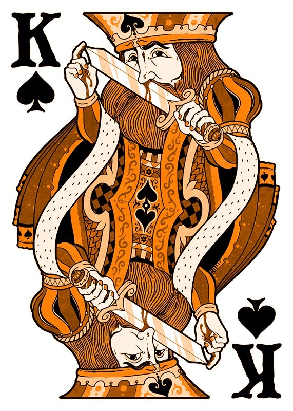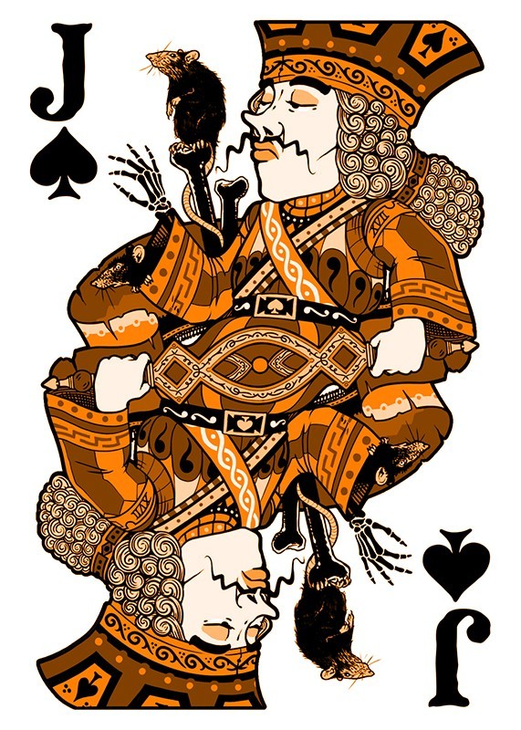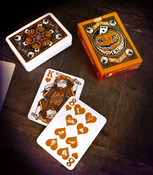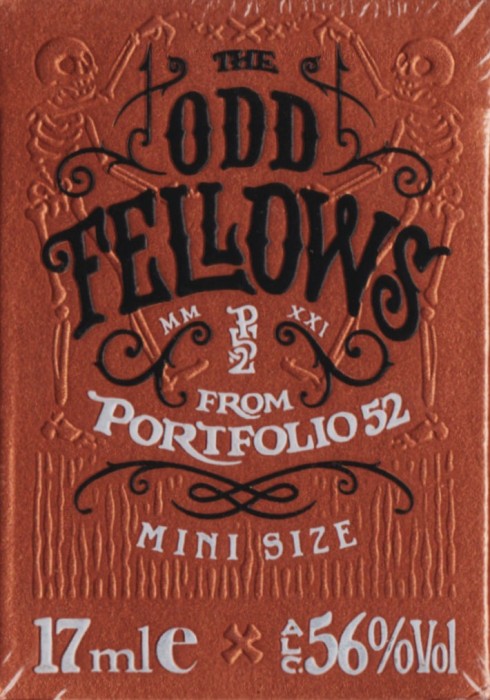 The custom illustrated court cards feature a wildly intoxicated bunch with custom illustrations for each individual pip. The back designs are also 100% custom to each deck in the Odd Fellows series while still maintaining a cohesive design to maintain integrity throughout. This special deck was unlocked on Halloween of the Kickstarter campaign and is mini deck in size.