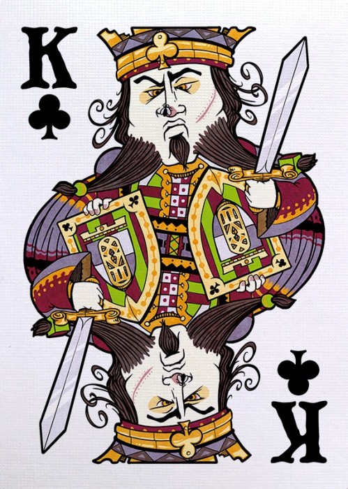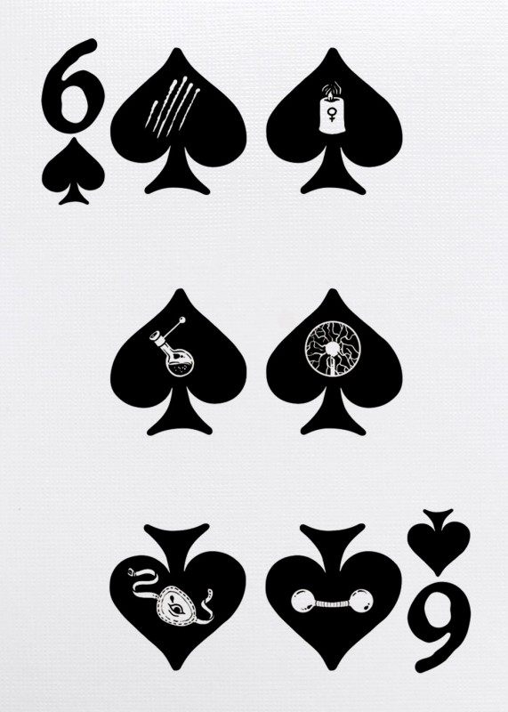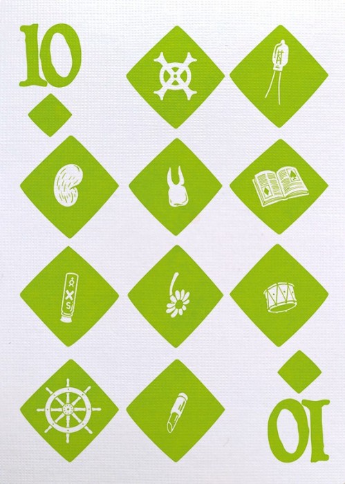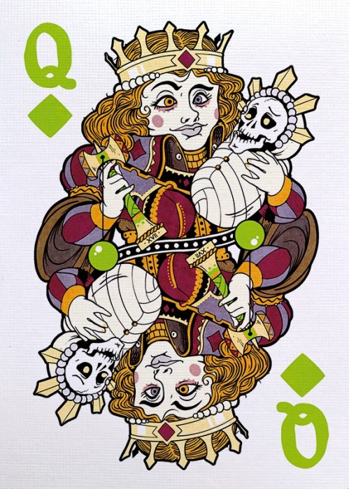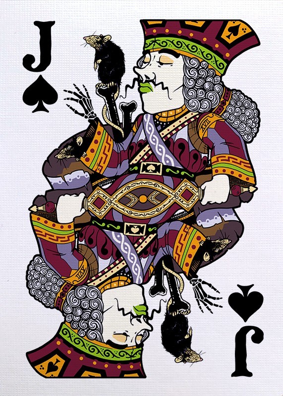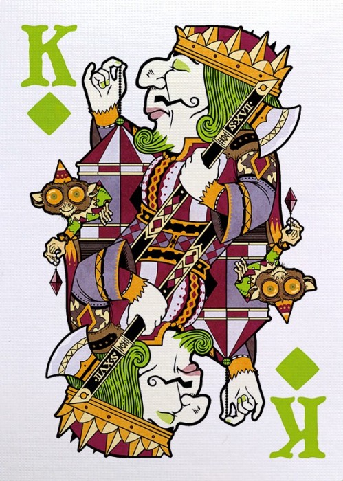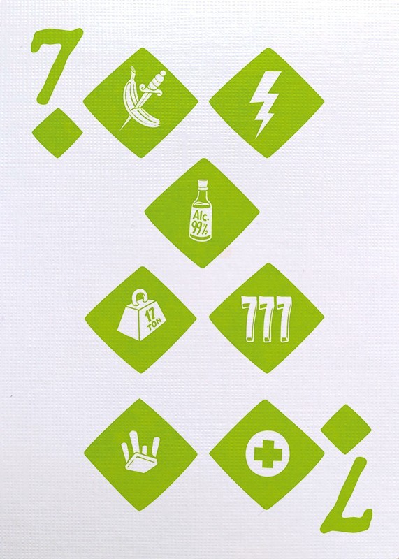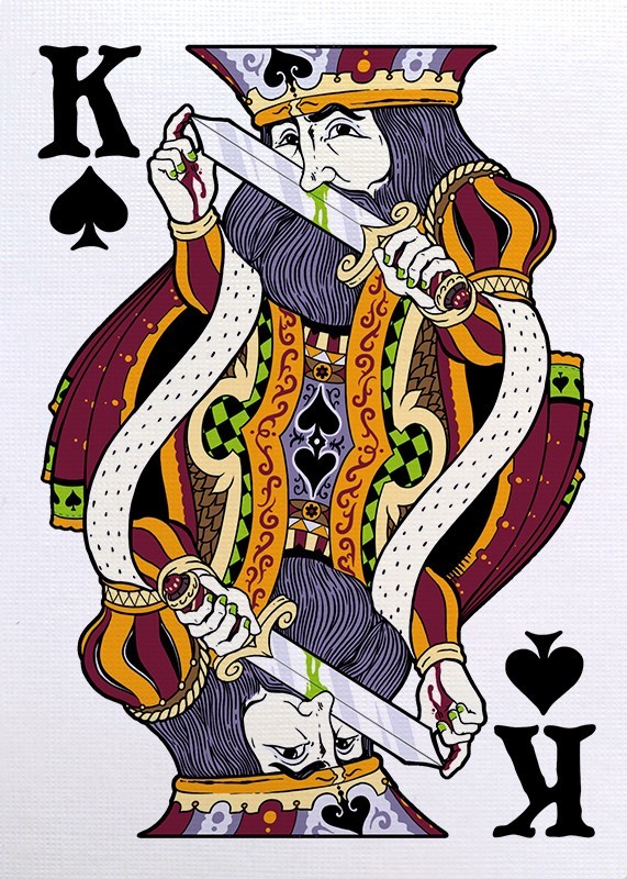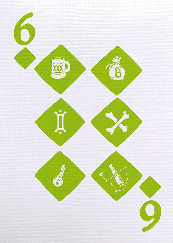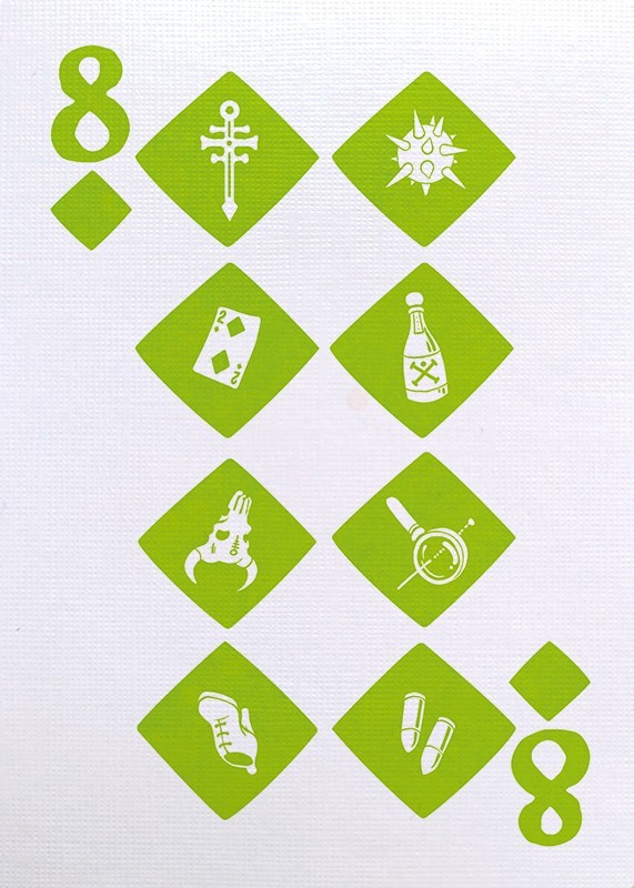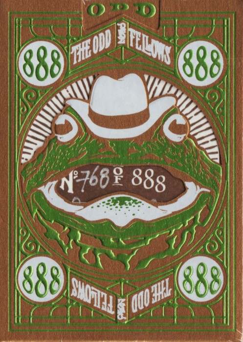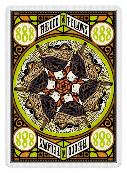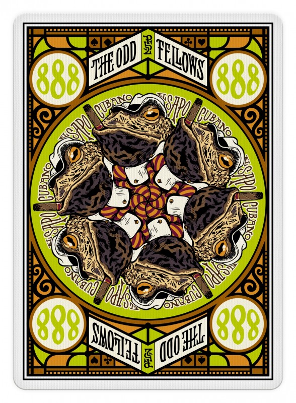 The custom illustrated court cards feature a wildly intoxicated bunch with custom illustrations for each individual pip. The back designs are also 100% custom to each deck in the Odd Fellows series while still maintaining a cohesive design to maintain integrity throughout.