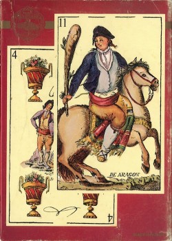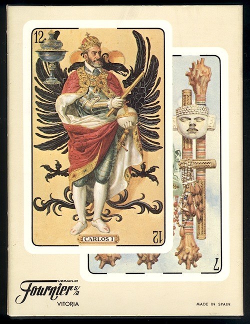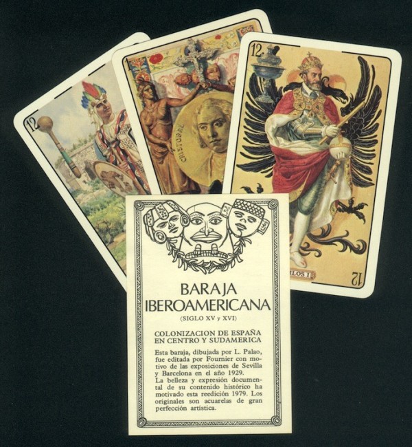 Outstanding original watercolours by L. Palao about the colonization by Spain of Central & South America. Made by Viuda E Hjos de H. Fournier, Vitoria. Presented at the Iberian-American Exhibition in Seville, 1929. This is a facsimile of the deck created in 1929, reproduced to commemorate the 50th Anniversary of the Ibero Americana Exposition (Seville & Barcelona), the first World Fair in Spain. Suits & Figures Gold Escudos - Christopher Columbus - his first voyage 1492. Figures: Fernando V; Cortes : Pinzon Drinking Glasses - of the time, preserved in different museums. Figures: Carlos I; Pizarro; Mendoza Swords - Figures: Felipe II; Legazpi; Magallanes Clubs - Figures: King Montezuma; Atahualpa; Caonabo Reverse: Coat of Arms of Spain in the time of Charles I, with the golden fleece. The outer border is formed by the 22 shields of the American Republics, with the shield of Portugal. in the four corners are stamped the arms of Castile, Navarre, Leon and Aragon. 40 cards (complete) 6.2 cm x 9.5 cm In special box - plastic frame in paper sleeve. Fournier: vol. 1, page 87, #676 of Spain
