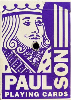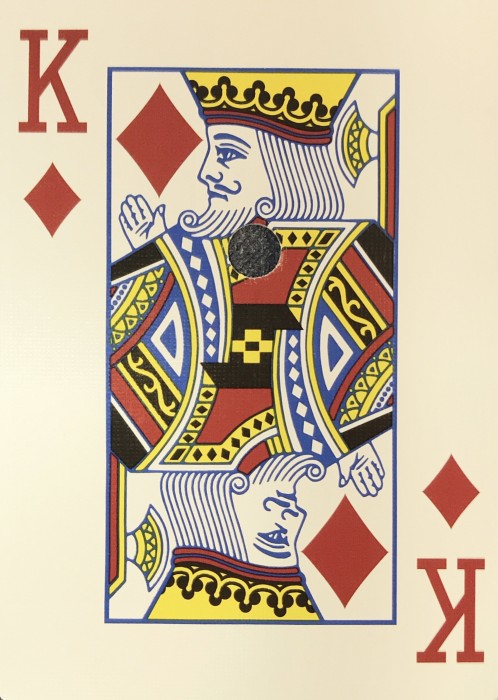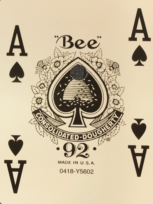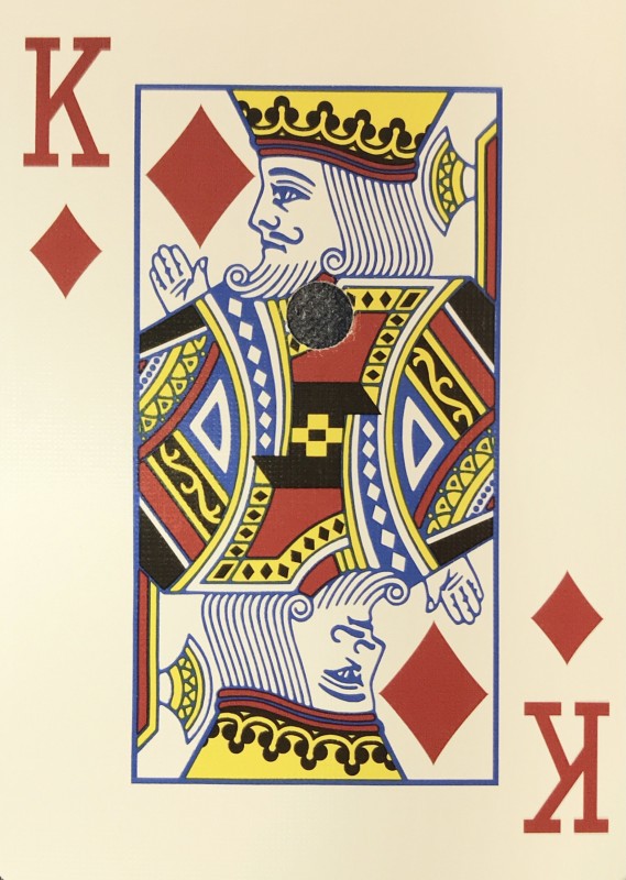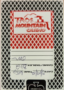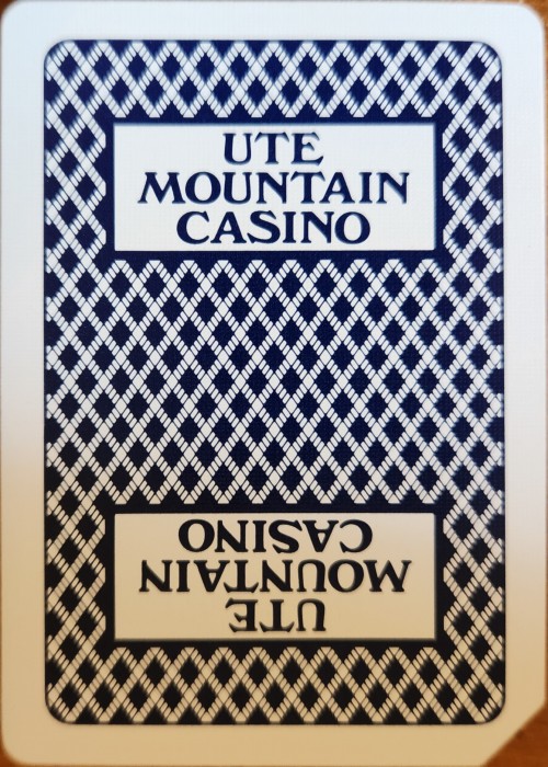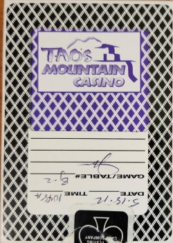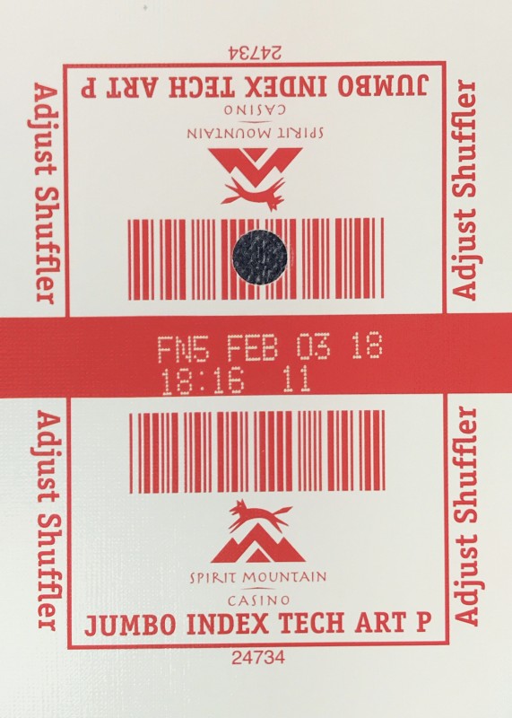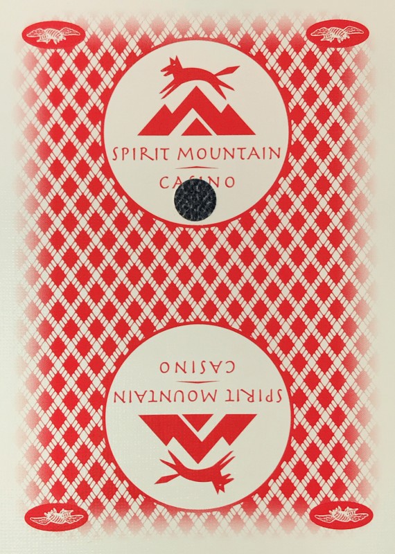 A casino deck from Spirit Mountain Casino in Grand Ronde, Oregon. Includes scan card for dealers, an “Adjust Shuffler” scan card with date of use (FEB 03 18), and the deck has been punched with a hole to show they have been in use at the casino.
