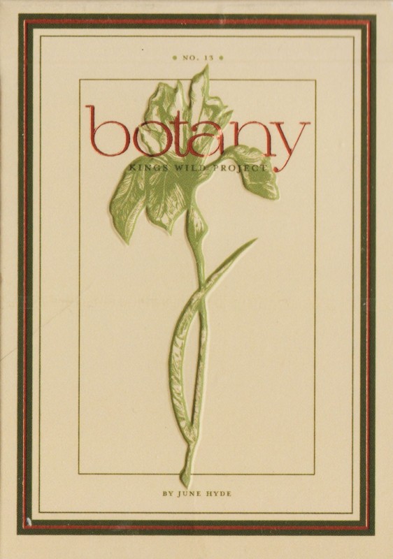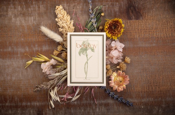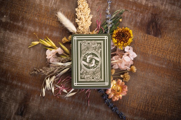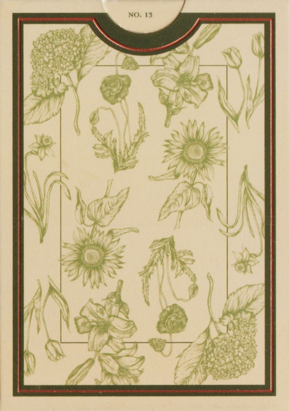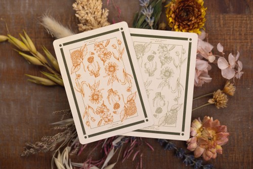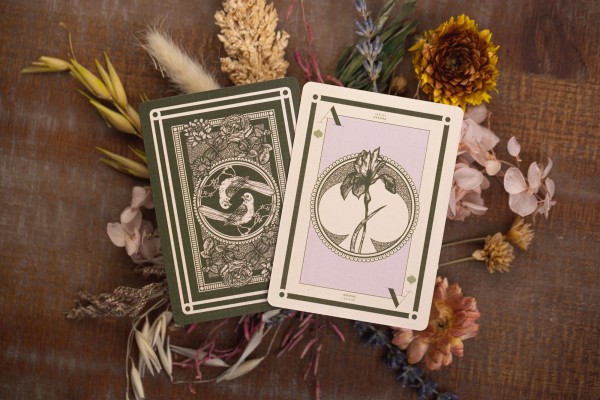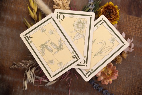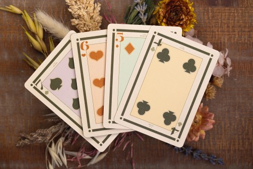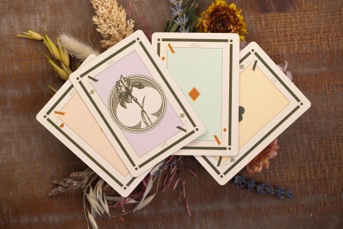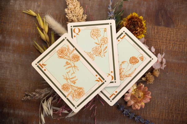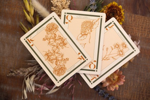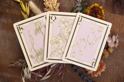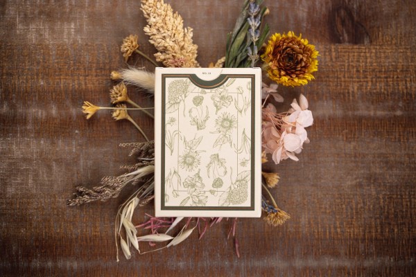 Designed by June Hyde, Botany takes inspiration from old scientific botanical illustrations. Each court card features a different plant species, all of which are included on the two jokers. The cards and tuck both feature a minimalistic design approach, utilizing a soft, muted color scheme that accents the scientific illustration motif.