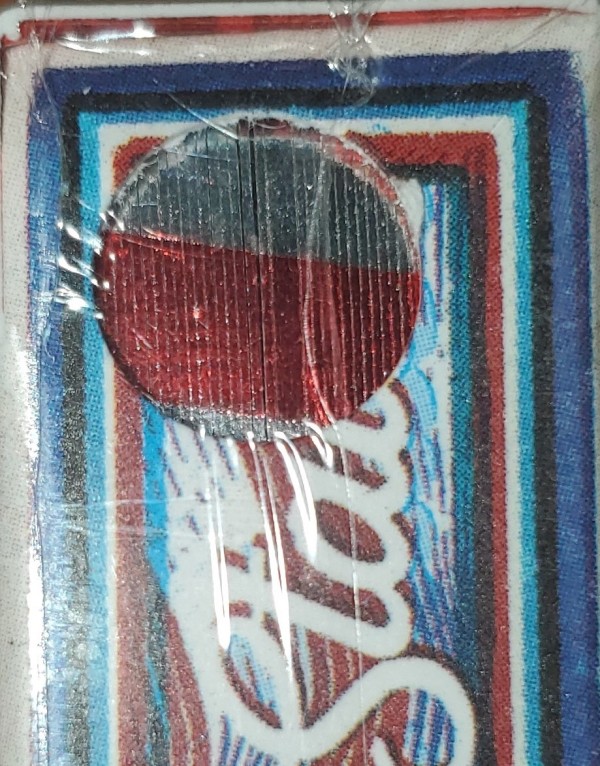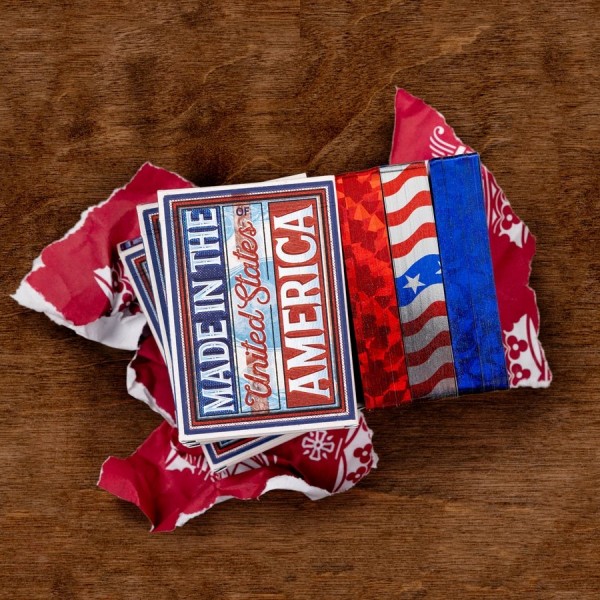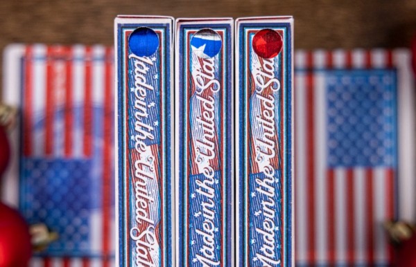 "Nothing says 'Merica like a little sparkle! We have three gilded Made in the United States of America decks to bring your way. Featuring a Blue, Red and for the first time ever, an American Flag Gilding. These Gildings are some of the finest we've ever produced."-From the Kings Wild Project website. This is the American Flag Gilded version. Decks are not numbered and feature a unique flag gilding that can be viewed from either side of the tuck through a small round cutout. Three Gilded decks were made available including a Red Gilded deck, Blue Gilded deck, and an American Flag Gilded deck. There were only 70 Red Gilded decks, 70 Blue Gilded decks, and 55 American Flag Gilded decks made available. They were sold on the Kings Wild Project website starting on the 7th day of the 2021 "12 Days of Christmas" event on the 7th of December, 2021.