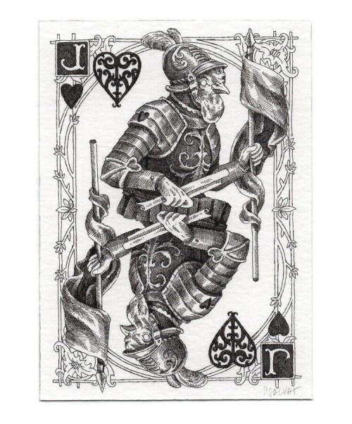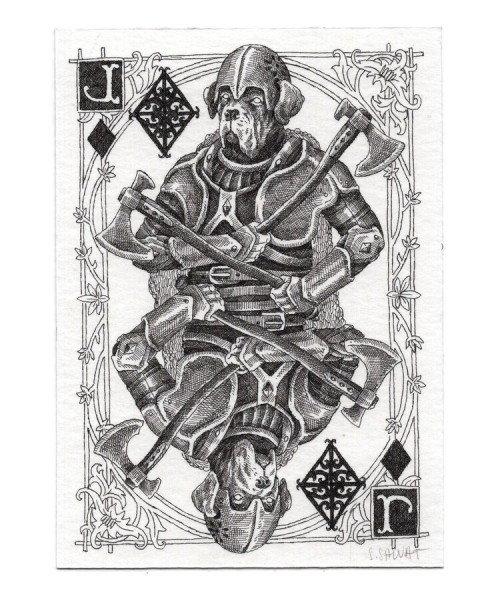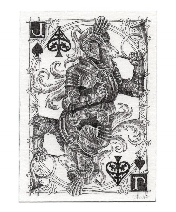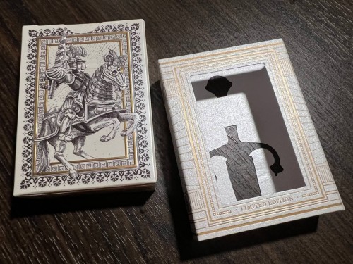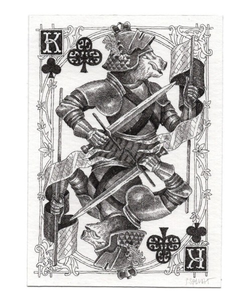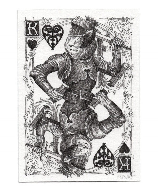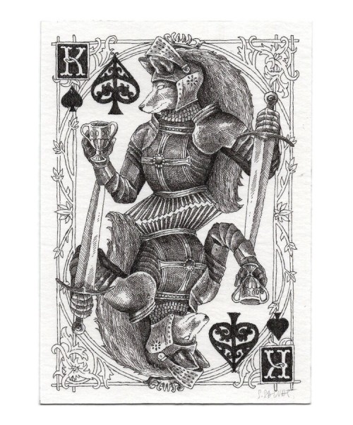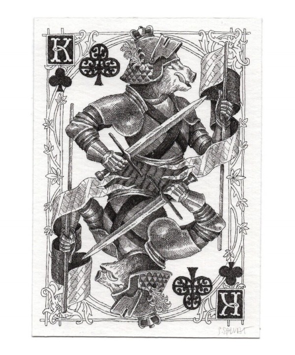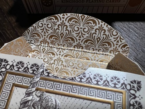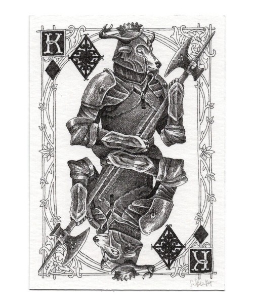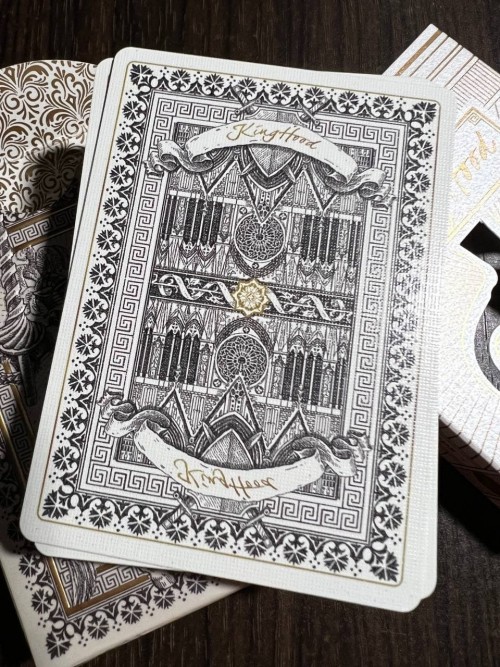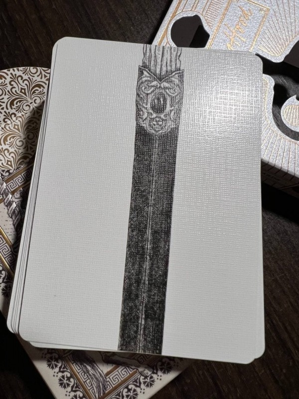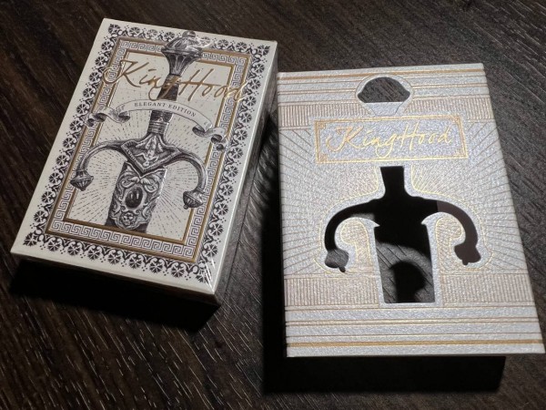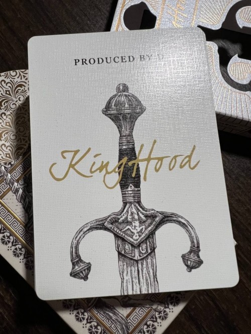 This is the standalone version of Kinghood deck. The artworks on the cards are monochromatic, with the exceptions of the red suit cards, which has the red color. All court cards are featuruing anthromorphic nobles of various animals - they don't have eyes, so to assume these are drawings of statues, or drawing of "souless" creatures. The cards only have standard finishes, no metallic ink nor foiling. The deck comes with a decksleeve - only 1000 decks of this edition is made.