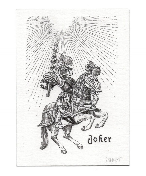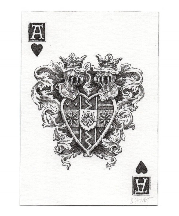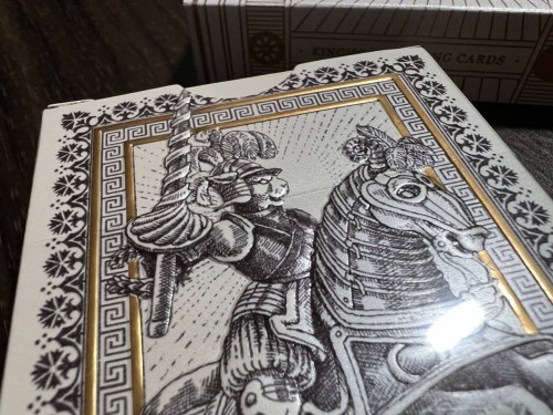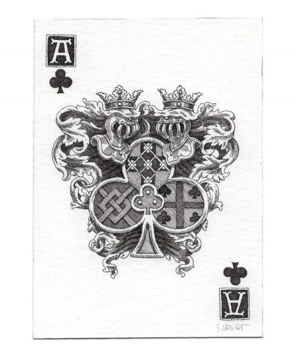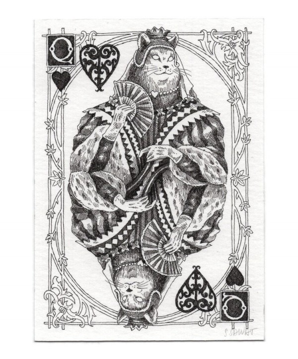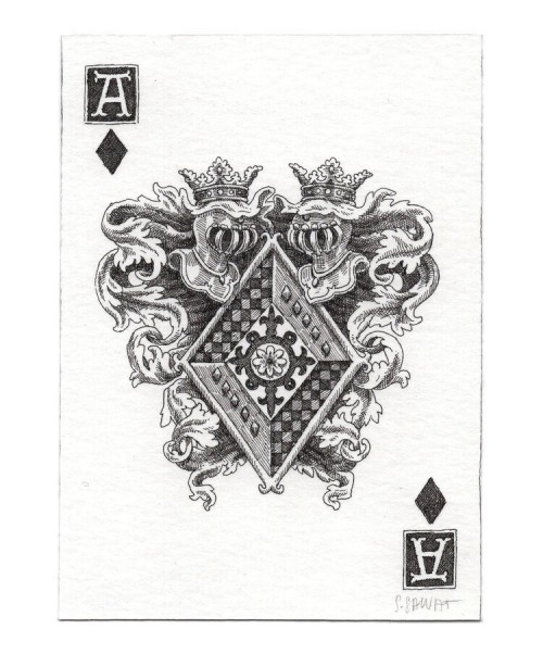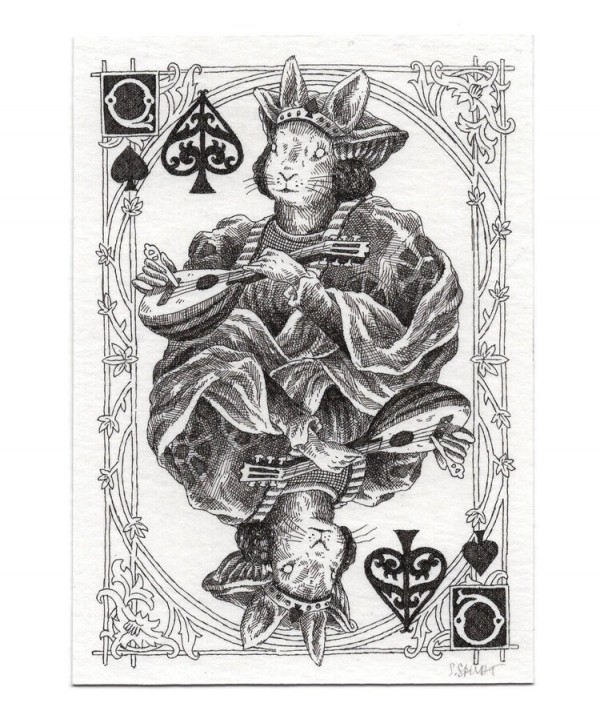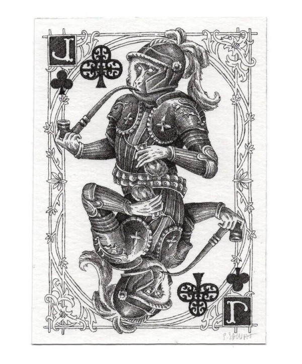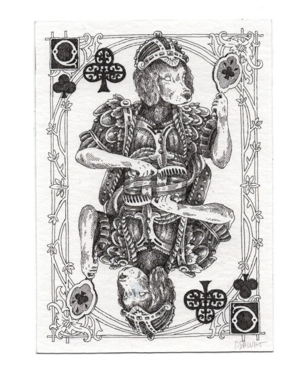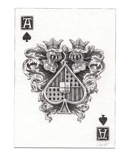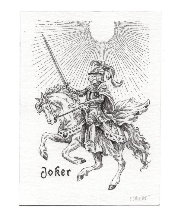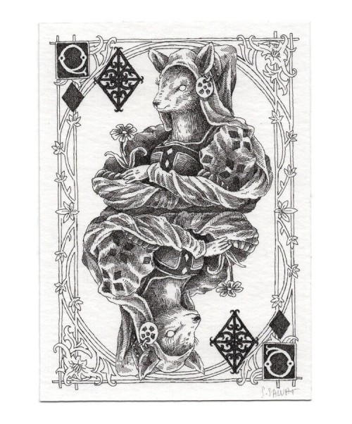 This is the standalone version of Kinghood deck. The artworks on the cards are monochromatic, with the exceptions of the red suit cards, which has the red color. All court cards are featuruing anthromorphic nobles of various animals - they don't have eyes, so to assume these are drawings of statues, or drawing of "souless" creatures. The cards only have standard finishes, no metallic ink nor foiling. The deck comes with a decksleeve - only 1000 decks of this edition is made.