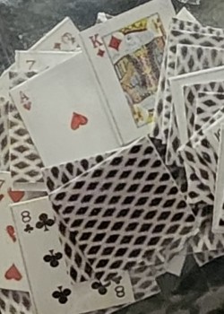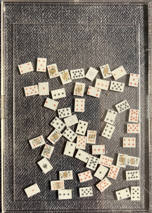 Mini thumb deck with gold stand. Cards measure 3/4” x 1 1/8”. Stand measures 11/16” x 15/16”.