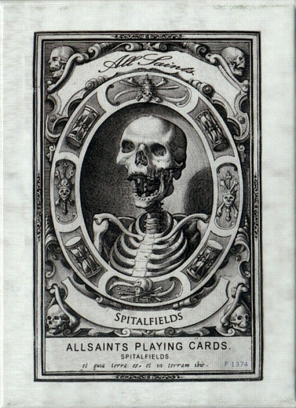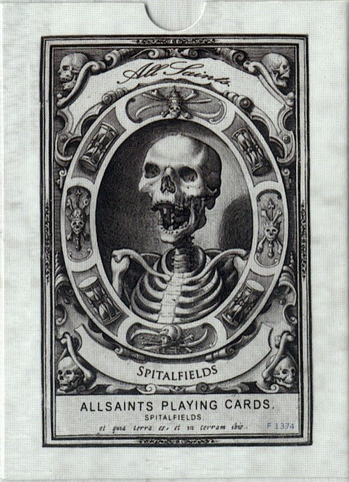 This is a non standard deck issued by AllSaints, a British fashion retailer headquartered in Spitalfields, London, UK. The deck is discontinued and very hard to find. The cards have an all over slightly textured warm gray colour. The pips are customized and feature anatomically correct hearts, skull and bones in the clubs, a razor blade diamond, and a goat skull in the spades. The court designs are the same for each suit, except for colouring. The deck was issued without plastic wrap on box or cards.