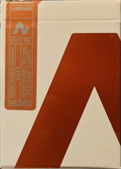 A project by Adrian Valenzuela, creator of the AVTones brand. Featuring futuristic and cyberpunk styles in the tucks, cards, and drawer case, the 2049 project highlights five different tucks with two variations on the cards themselves. The tucks include Carbon Standard, Carbon Gilded, Karma Standard, Karma Gilded, and Replica Gilded. The cards are all the same back and face design with orange gilded edges featured for the gilded decks.