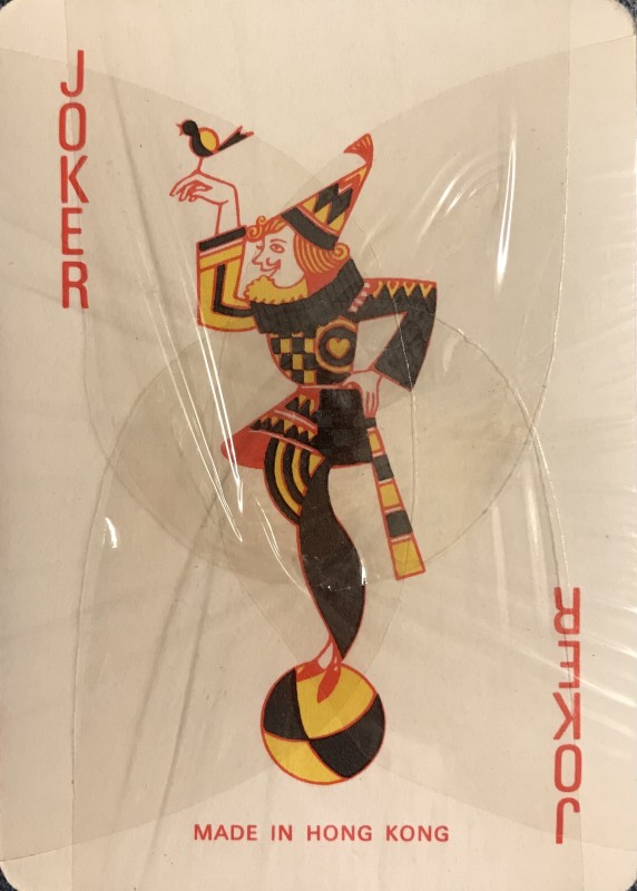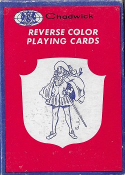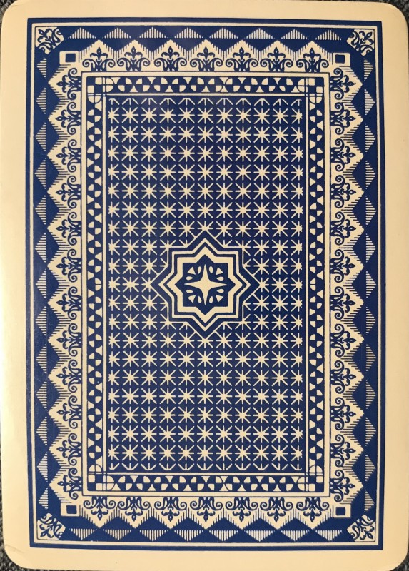 Blue back standard playing cards. Box features a joker head inside a spade on the shield.