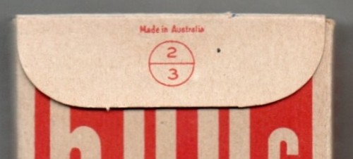 The key date is the introduction of the Excise Duty in 1932. From then onward all Australian manufacturers had to have their code number printed on each pack, as well as ‘Made In Australia’. This makes it much easier to identify decks, as prior to 1932 there was no such requirement, and often our local decks can look just like ones printed overseas. Taxation on playing cards was repealed in 1983.