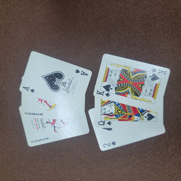 1960's era - A complete deck with jokers of Stardust Miniature playing cards. Measures about 1 1/2" x 2 1/2". Back of box has 3 fish on it.
