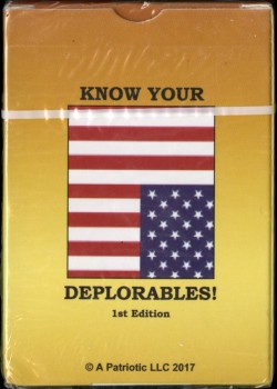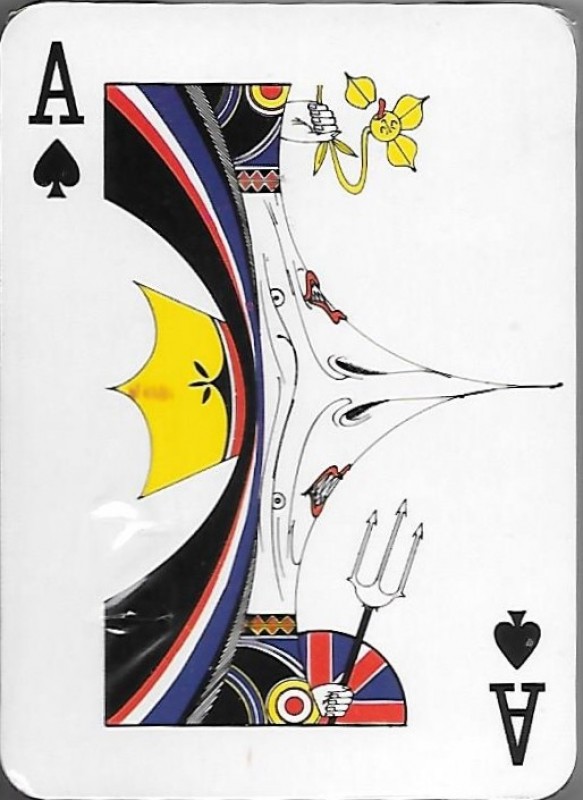 Each illustrator designed the Aces and court cards for one of the four suits: Marc – Diamonds (and Jokers); Trog – Clubs; Scarfe – Spades; and Springs – Hearts. The illustrations are of then leading political leaders in the four major British political parties: Conservative Party (Margaret Thatcher, etc.); Labour Party (Michael Foot, etc.); Liberal Party (David Steel, etc.); and Social Democratic Party (Roy Jenkins, etc.). There are 52 cards in the deck, plus 2 Jokers, with an accompanying booklet that briefly describes the artists, and identifies the persons illustrated. The cards are wide, measuring 90mm x 63mm, and come in a very nice original box.