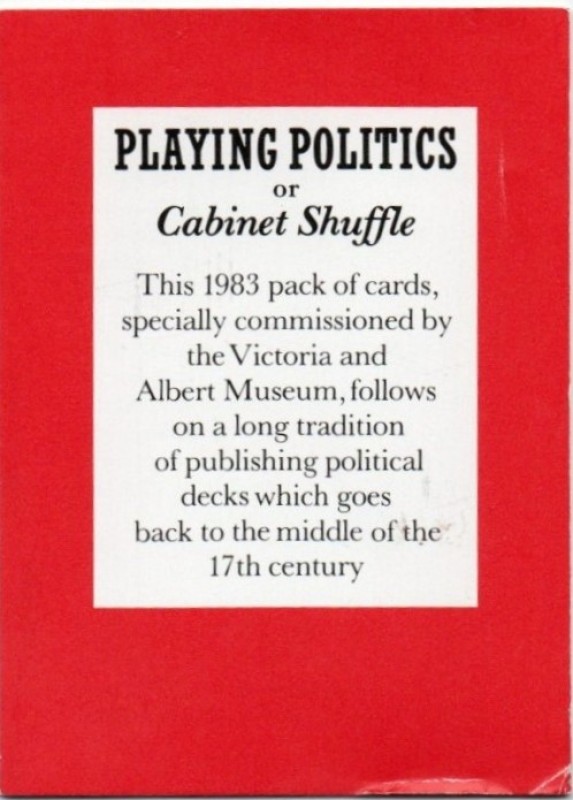 Mint, sealed deck of outstanding cards, titled "Playing Politics" and subtitled "Cabinet Shuffle," commissioned and published by the Victoria and Albert Museum in association with Intercol London, and printed by Carta Mundi, c.1983, with illustrations by then leading British caricaturists, Marc, Trog, Gerald Scarfe, and John Springs. From the accompanying pamphlet: "This 1983 pack of cards, specially commissioned by the Victoria and Albert Museum, follows on a long tradition of publishing political decks which goes back to the middle of the 17th century." The cards are pamphlet are sealed inside the box, but the cards can be seen at the World Web Playing Card Museum. (WWPCM #01441)