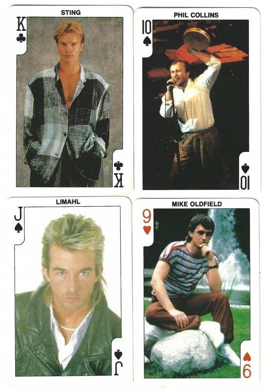 Produced in 1987 by a bubble gum company, Dandy in the UK. A packet would contain a stick on pink gum, with 3-5 cards. The entire set consisted of 52 cards, plus 4 jokers. Each front depicted a photograph of a current popular music artist in Britain. There was no box with the set.