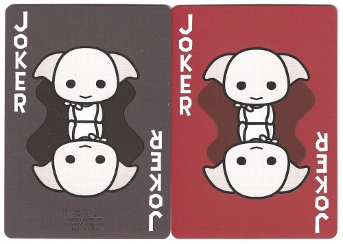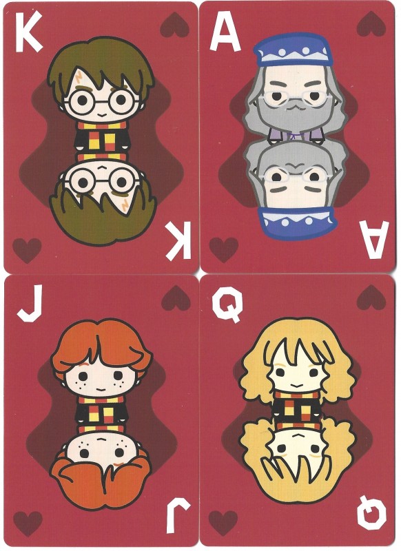 Designed in the UK and made in China, this reasonably decent deck are in an oversized box measuring, 11.5cm by 14cm for no apparent reason!. The character Dobby appears on both jokers, with Harry, Ron, Hermione and Dumbledore appearing on the court and aces, repeated four times. The images are basic "bobble head" style images.