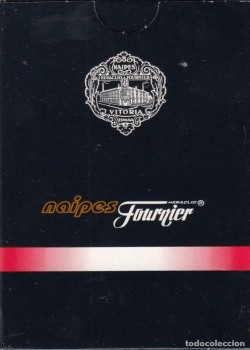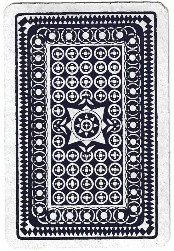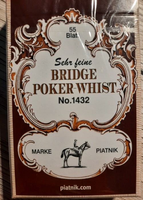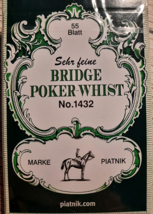 Bridge, Rummy, Whist. French Picture (meaning the design on the front of the cards) No 11, 54 cards, Matched back. On the side of the box its says, " Mit Goldecken, meaning with gold corners, though there is no trace of this on the cards. The box is wrapped in a UK tax duty wrapper of C Goodall & Son, the design of which dates to 1940.