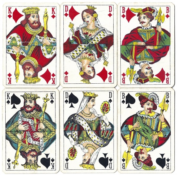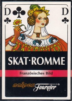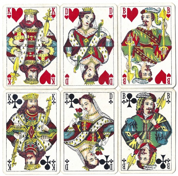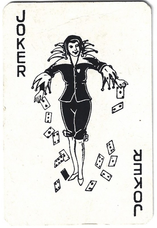 German deck, dating from around 1940. 52 cards and 2 Jokers. Pips are Hearts, Clubs, Diamonds, Spades. The translation from the front is: