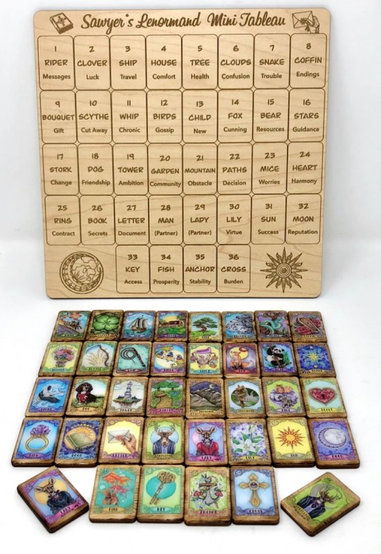 Sawyer’s Path Lenormand as miniature heirloom Lenormand Tiles with matching Mini (grand) Tableau Casting Board
