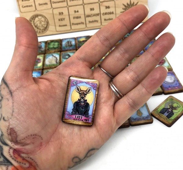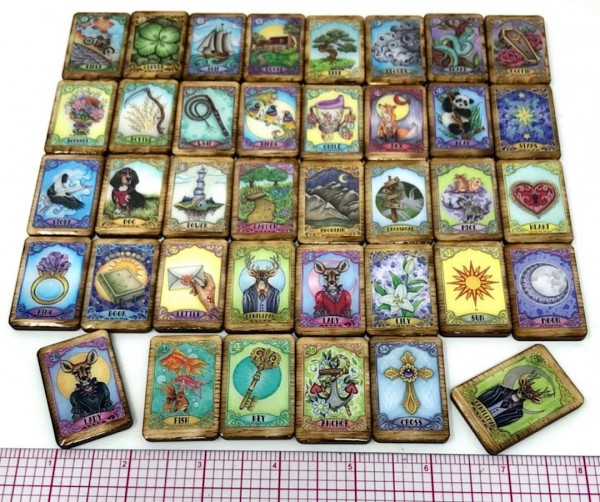 Each tile measures approximately 1”x 1.5”, (2.54cm x 3.81cm) the wood is burned for a worn effect*, the images are printed on high quality vinyl, then resin sealed for a completely durable and unique look. The backs feature the Sawyer’s Lenormand sigil.