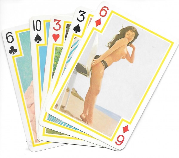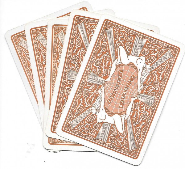 Vintage from the 1950s A vintage complete set of adult risqué playing cards Titled Paradise of Naked Beauties 54 models plastic coated colour laying cards NO. 4444. Made in Hong Kong. They measure about 4"x 6"