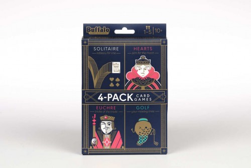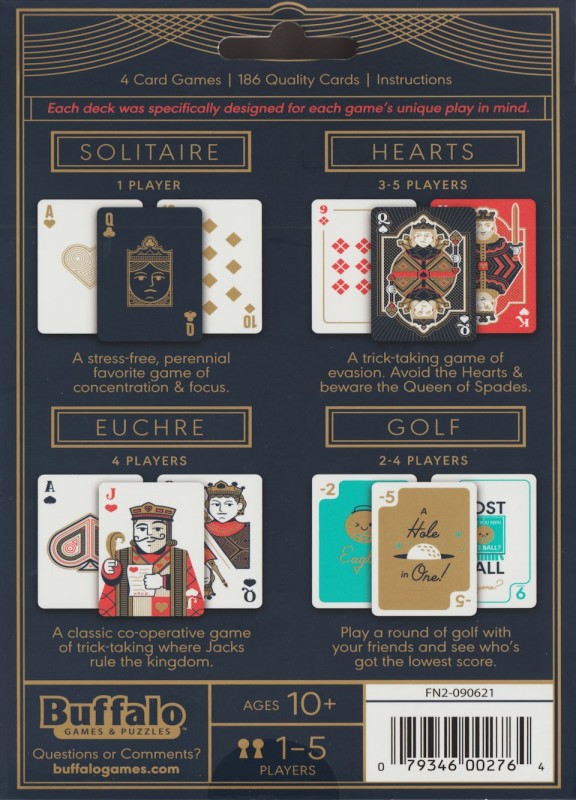 Four of the most popular card games all together in one premium pack! Including Solitaire, Hearts, Euchre, and Golf, each game has its own unique deck of cards specifically designed for the play of each game. In Solitaire, cards have color-coded suits for easy stacking. In Hearts, the heart cards and queen of spades are colored for easy scoring. The Euchre deck is streamlined for easy setup and contains unique scoring cards. Golf has customized cards not found in a normal deck designed specifically for the game. Whether you are shooting for the moon in Hearts, or driving for the lowest score in golf, this pack of card games kill keep your family having fun.