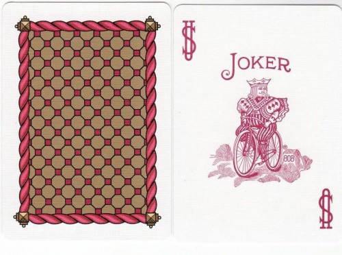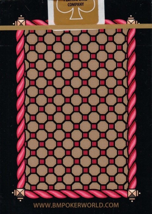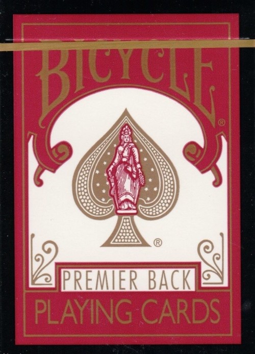 The Bicycle Premier Back was produced by BMPokerworld and sold exclusively in their web store. It features a gold and burgundy back design surrounded by a velvet rope and white borders, with matching standard style face cards. The black suits are in gold, while the red suits are in burgundy. Metallic ink is utilized both on the back as well as the face cards. The box shows the back design with a black border, has a gold seal and no barcode. Comes with 2 standard Jokers in gold, 1 smaller Joker in burgundy, and a blank faced gaff card.