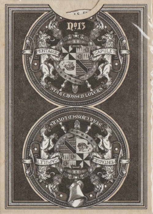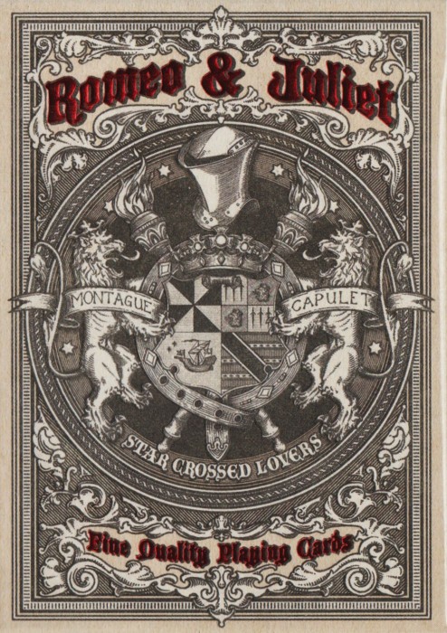 A luxurious deck of playing cards made with high-quality materials featuring a classic intricate design that is both elegant and timeless. The classic Shakespearean Romeo & Juliet comes to life in a new way through this beautiful deck of luxury playing cards. The Romeo & Juliet deck of playing cards features hand-inked two-way court cards, classic pips and a two-way seal back design.